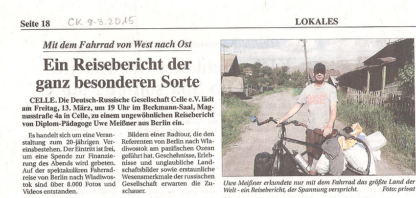 Auf der Reise konnte er dank seiner russischen Sprachkenntnisse mehr als nur einen oberflächlichen Blick auf Land und Leute werfen. Für uns Zuhörer war gerade die vielfache Begegnung mit Menschen der unterschiedlichsten russischen Regionen in besonderem Maße fesselnd. Uwe Meißner erfuhr überall eine herzliche Aufnahme und große Anteilnahme an seinem Fahrradprojekt.